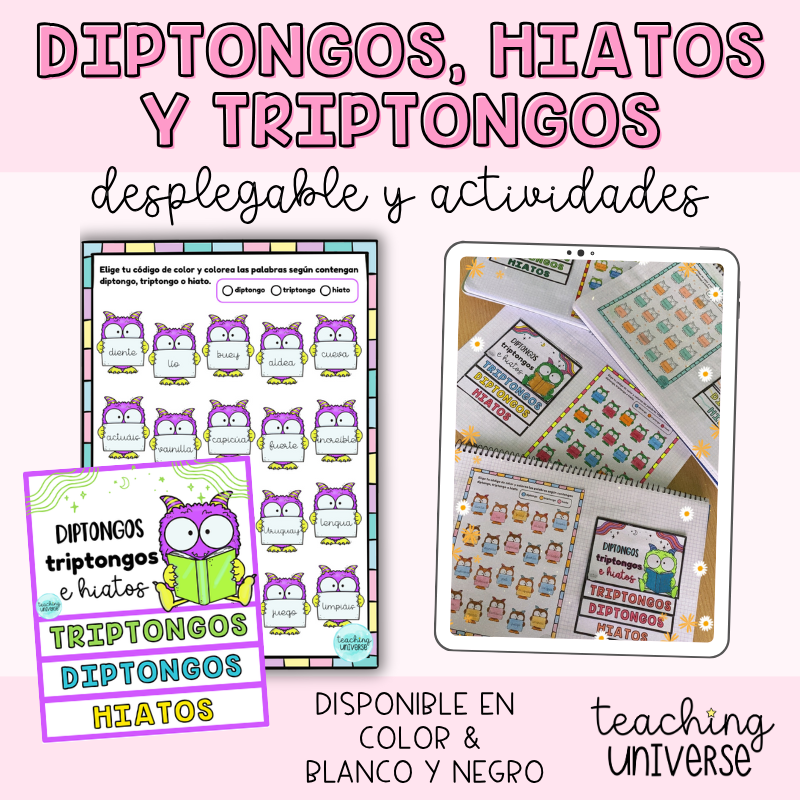 Material imprimible para Primaria para trabajar diptongos, hiatos y triptongos: incluye desplegable con teoría y actividad para colorear palabras según su tipo. Disponible en color y blanco y negro.