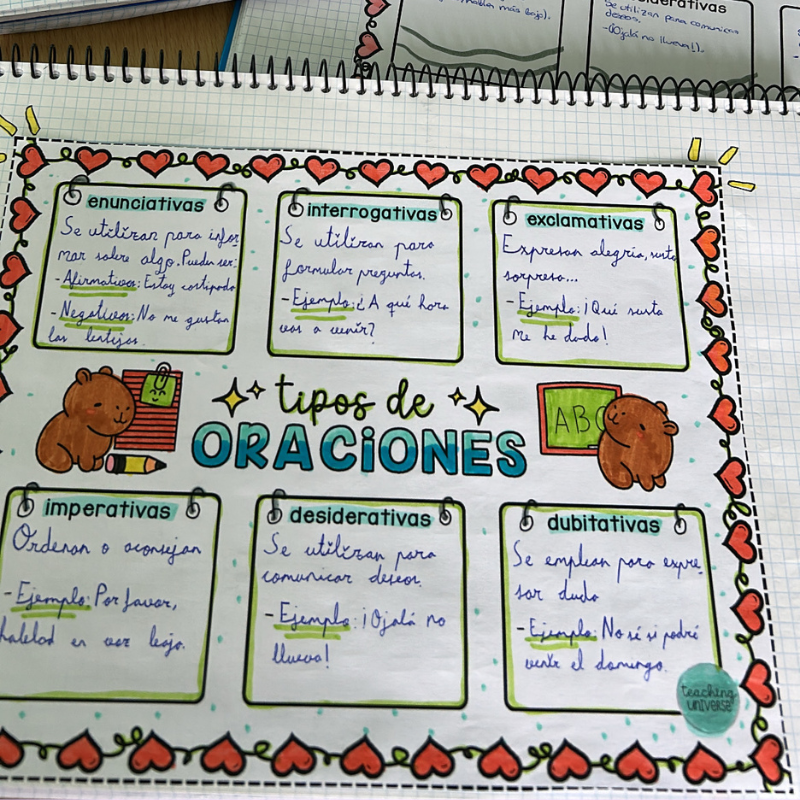 Plantilla lista para imprimir y completar con información sobre los tipos de oraciones.