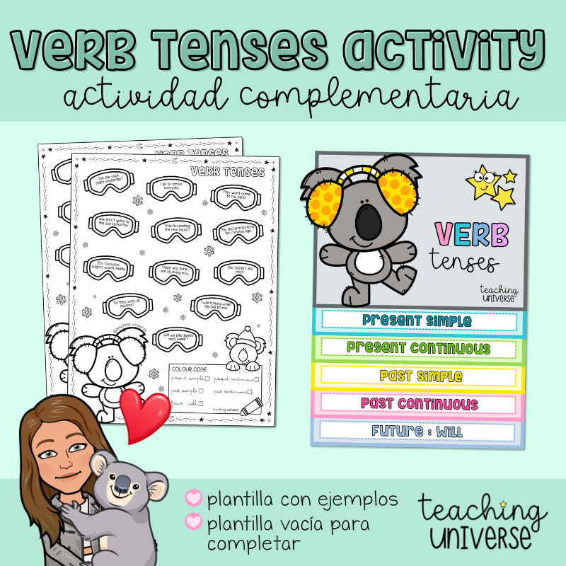 Actividad para trabajar los tiempos verbales en inglés. Está pensada para complementar al desplegable de tiempos verbales que encontrarás en la web, en el apartado de inglés.