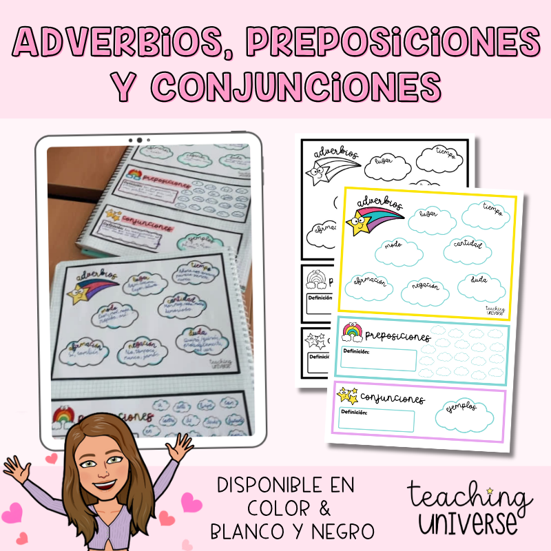 Con este recurso podrás trabajar los adverbios, preposiciones y conjunciones de una manera muy visual y sintética.