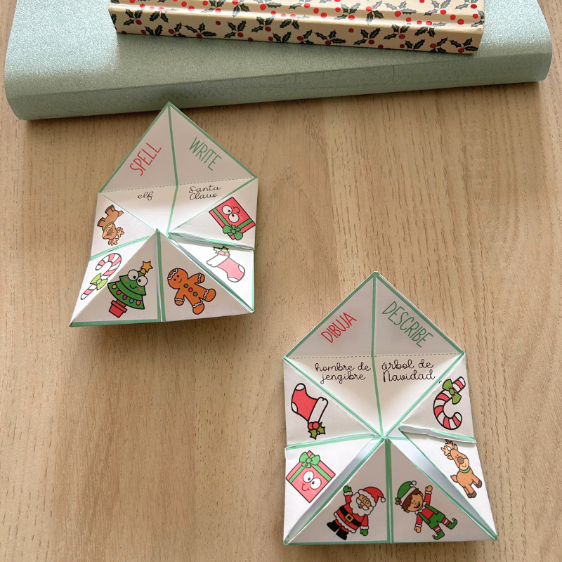 Un PDF imprimible con 4 variantes de comecocos navideños en inglés y español. - A printable PDF with 4 Christmas-themed cootie catcher variations in English and Spanish.